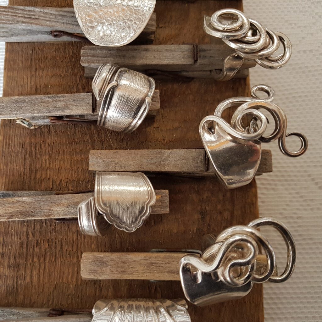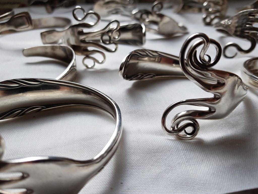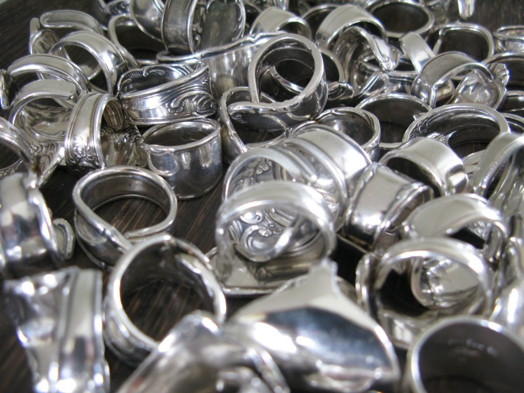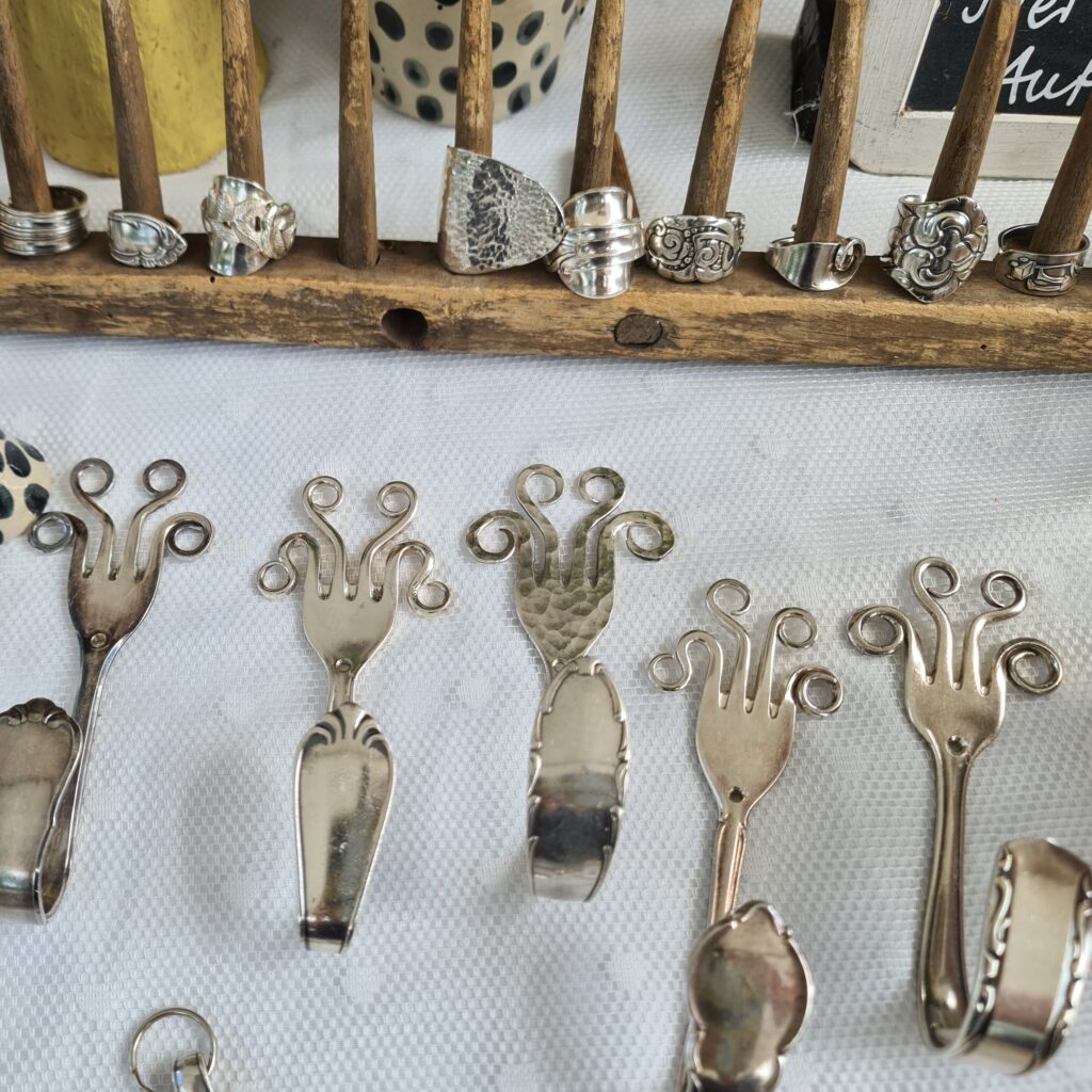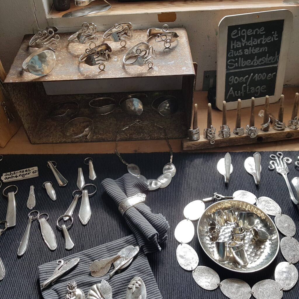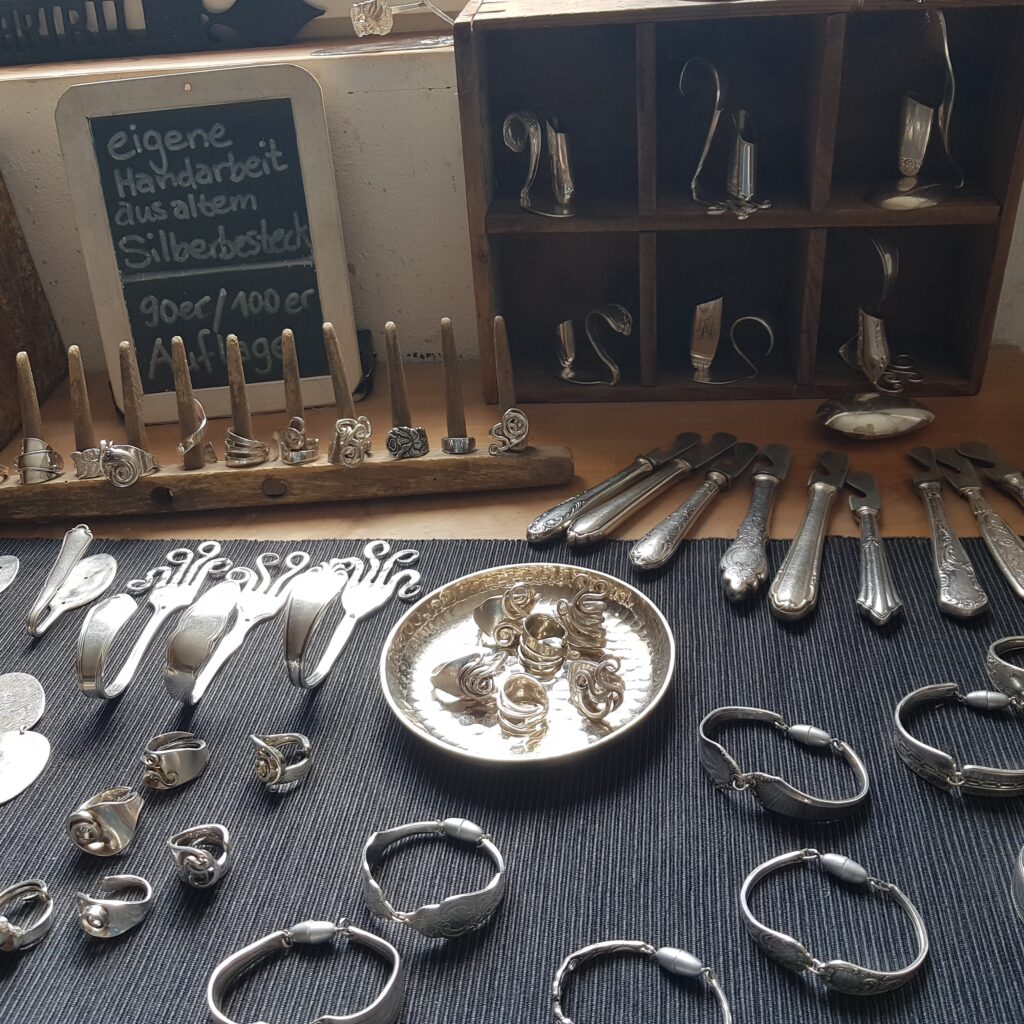 Die Idee: Dem alten Silberbesteck ein neues Leben schenken. Aus einer Kuchengabel wird ein Ring oder ein Armband, der Löffel wird zum Schlüsselanhänger oder Windspiel. Dies sind einige Beispiele wie man Silberbesteck, das ja häufig auch Familiengeschichte trägt, veredeln kann. In meiner Werkstatt und auf Märkten forme ich Bestecke in einem schonenden Verfahren so um, dass Gravuren und Muster erhalten bleiben. Aufträge sind jederzeit willkommen und eigene Bestecke können zum Markt mitgebracht werden.