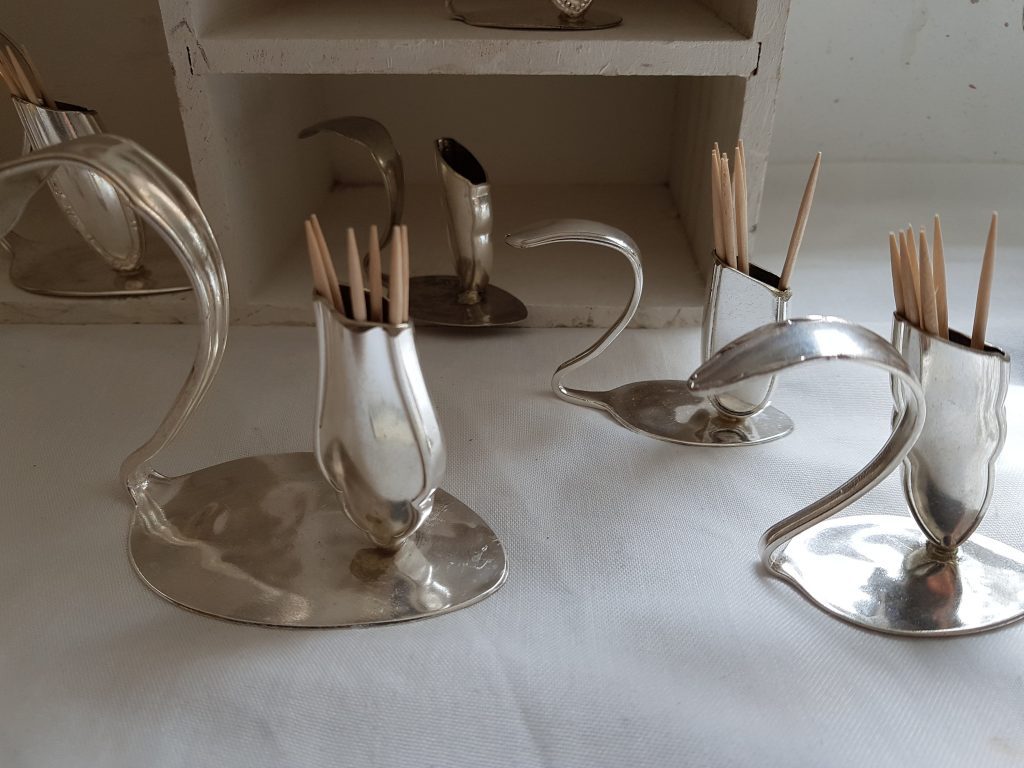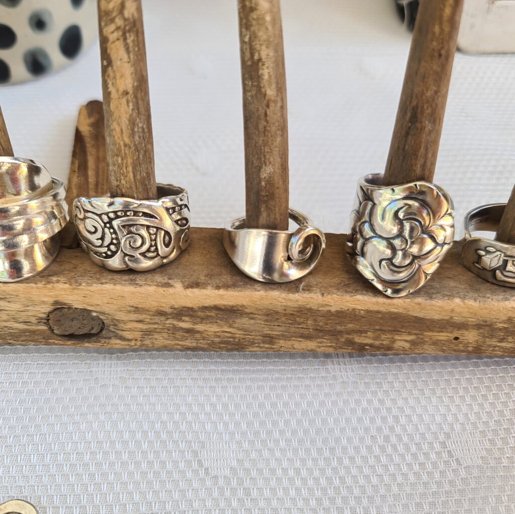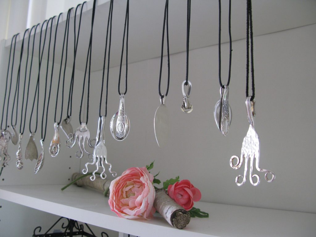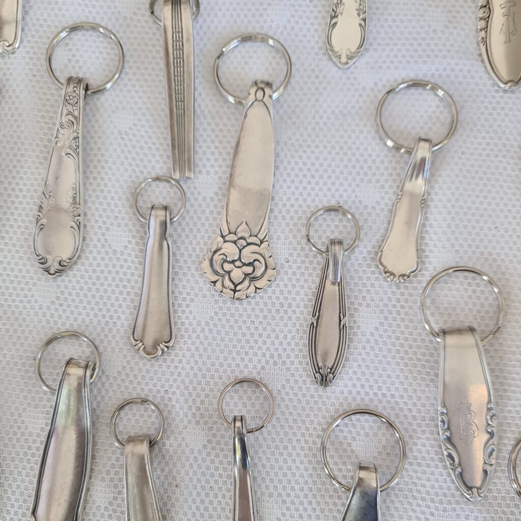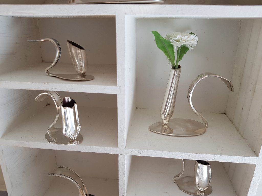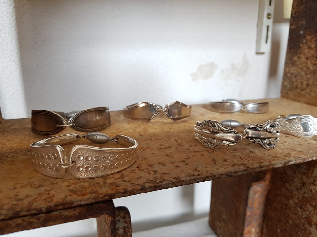 Die Idee: Dem alten Silberbesteck ein neues Leben schenken. Aus einer Kuchengabel wird ein Ring oder ein Armband, der Löffel wird zum Schlüsselanhänger oder Windspiel. Dies sind einige Beispiele wie man Silberbesteck, das ja häufig auch Familiengeschichte trägt, veredeln kann. In meiner Werkstatt und auf Märkten forme ich Bestecke in einem schonenden Verfahren so um, dass Gravuren und Muster erhalten bleiben. Aufträge sind jederzeit willkommen und eigene Bestecke können zum Markt mitgebracht werden.